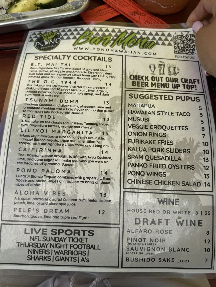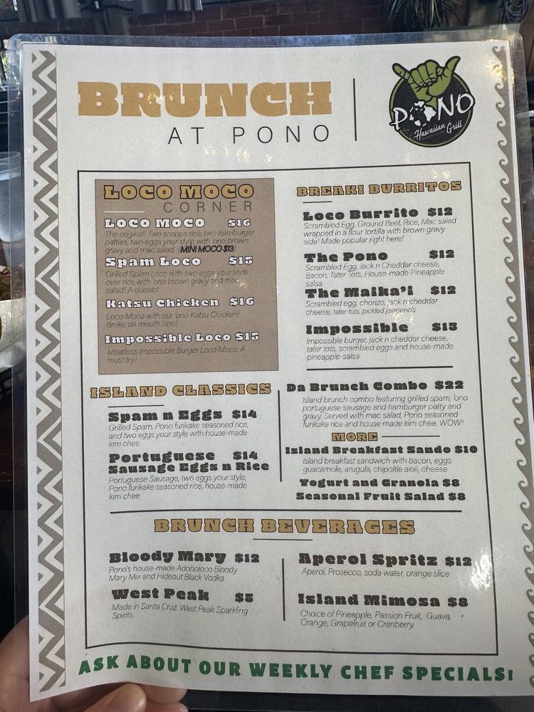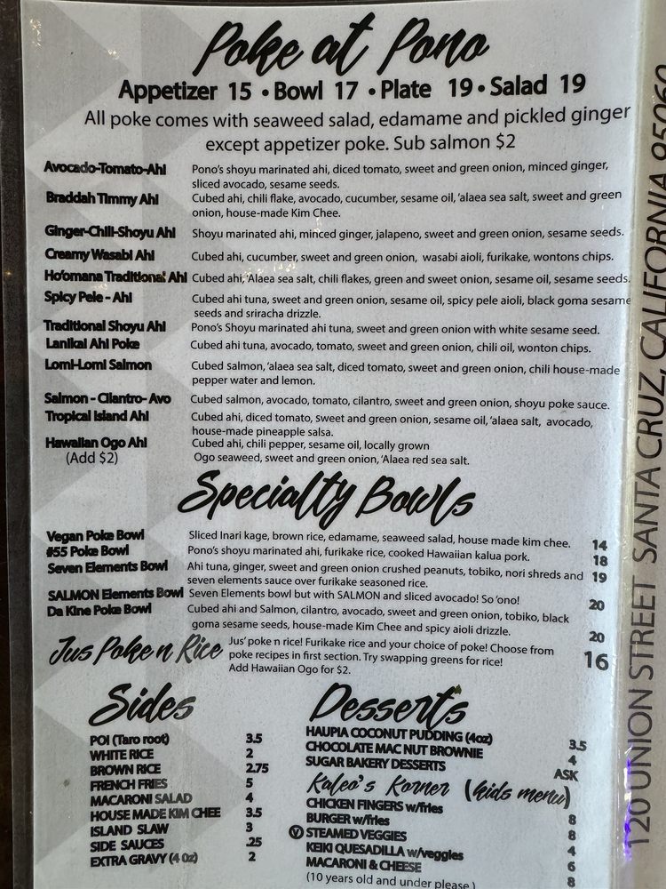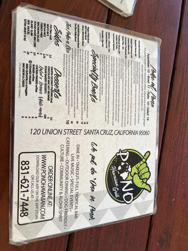 Pono Hawaiian Grill is a vibrant restaurant located in Santa Cruz, CA, offering a fusion of Hawaiian and seafood dishes. Known for their Poke bowls and flavorful appetizers like Chicken Musubi and Coconut Shrimp, Pono provides a diverse menu with vegan and vegetarian options. The restaurant is Asian-owned and provides a casual, trendy atmosphere with outdoor seating and a full bar. Customers praise the friendly service and variety of choices on the menu. The Avocado Tomato Ahi Poke Bowl and Braddah Timmy Poke Bowl are customer favorites, showcasing the fresh and delicious ingredients used in their dishes. With options for catering, happy hour specials, and the acceptance of cryptocurrency, Pono Hawaiian Grill caters to a wide range of preferences and dietary needs while delivering a memorable dining experience.