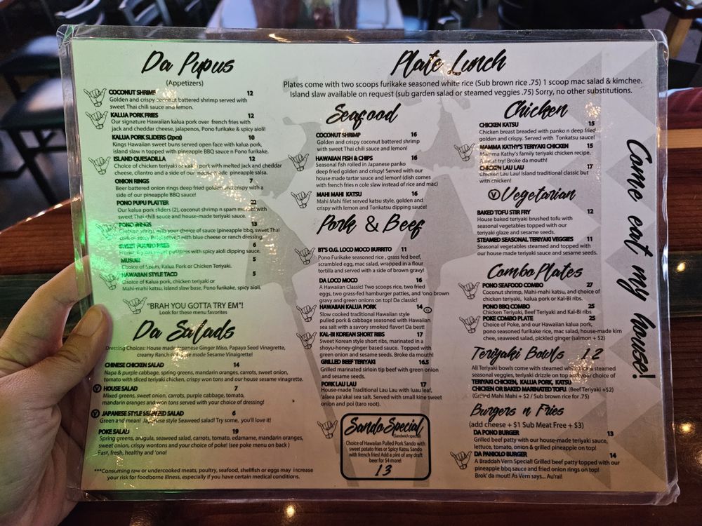 Coconut shrimp, Mahi Mahi katsu, and choice of chicken teriyaki, kalua pork, or Kal-Bi ribs. Served with Pono furikake rice, mac salad and kimchee