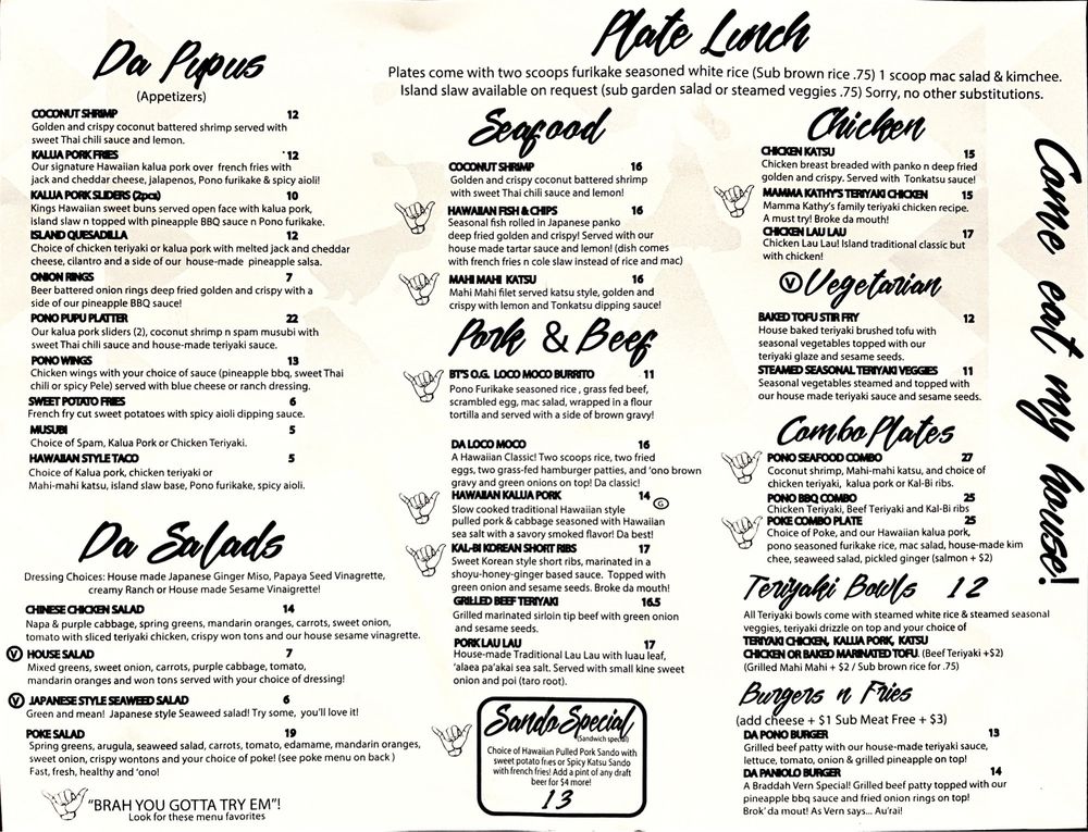 Choice of poke with our house-made Hawaiian kalua pork, Pono seasoned furikake rice, mac salad, house-made kimchee, seaweed salad & pickled ginger (sub salmon +$2)